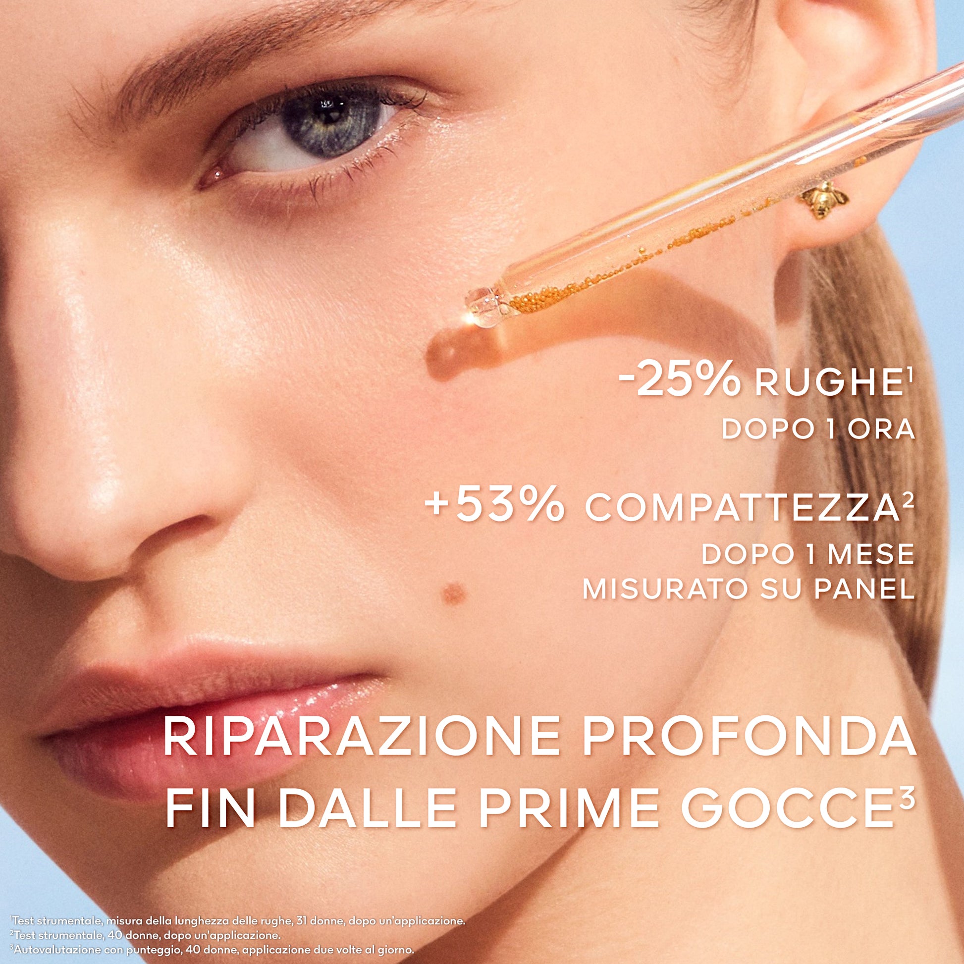 ¹Sull'epidermide. ²Test strumentale, misura della lunghezza delle rughe, 31 donne, dopo un'applicazione. ³Test strumentale, 40 donne, dopo un'applicazione. ⁴Autovalutazione con punteggio, 40 paneliste, applicazione due volte al giorno.