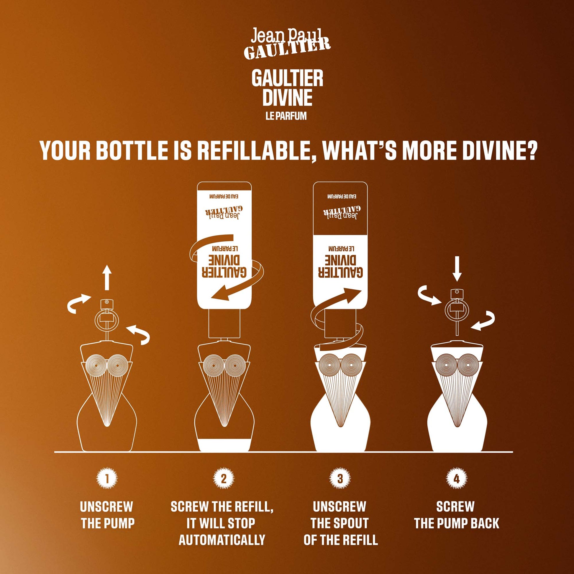 UNA FRAGRANZA FLOREALE AMBRATA INTENSAMENTE DIVINA. Sii te stessa, radiosa e sensuale, con questa eau de parfum ancora più intensa e audace rispetto all’originale. Il suo maestoso giglio e i suoi fiori luminosi di frangipani emanano un’abbagliante energia solare. La firma salata di Gaultier Divine abbraccia l’opulenza avvolgente del benzoino e la leggera nota gourmand di una meringa irresistibile. Eccoti circondata da un’aura inebriante e intensa, seducente e raggiante.